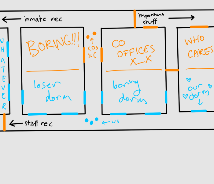 "Uh, I'm 25, and also that's not what I was gonna say." We check around the corner at the end of the hall for guards, then continue once the coast is confirmed clear. "I was thinkin', like, we should start thinking about how we can get more people to skip. How cool would it be if all of us just ended up, like, chilling all the time?"