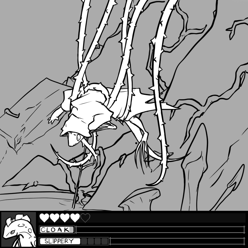 Examining the barrel, it looks like it has been torn apart and whatever was inside has been removed. It doesn't take Whisper long to spot the likely culprit, as a rustling and crunching noise draws her attention to a corner of the room containing a crumpled, cloaked figure and some kind of boar-like rat.