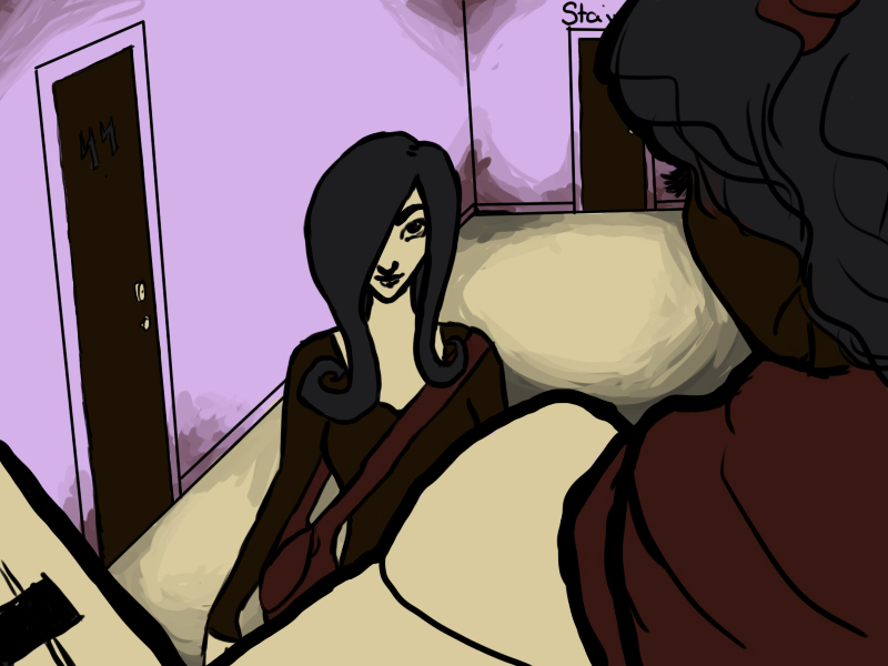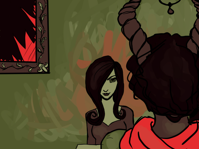 There was a broken mirror on the far wall, with shards of glass underneath it. There was a table to the right wall, wedged between the back corner and her stove. The counter tops and table were both stained with unknown substances, and she had several glass vials lying around, some full, some empty.