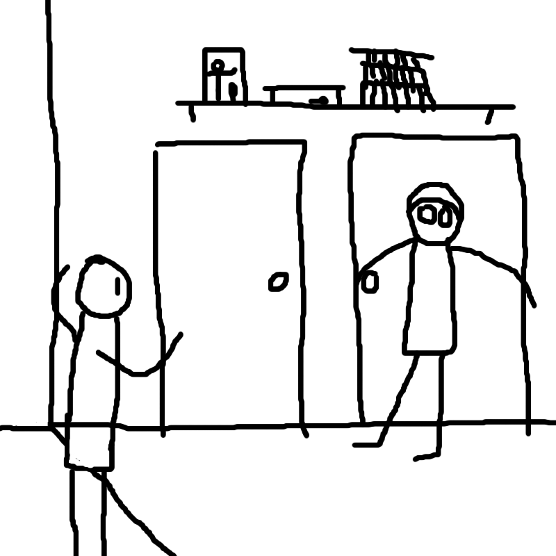 He can hear footsteps approaching behind him, and the faint sound of pained breathing, he needs to think fast. He feels something breathing on his neck, and he decides to bolt for the door and see what's on the other side.