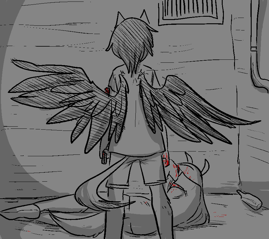 A child was standing over a bloodied and beaten woman, who was cowering for her life. The child had a lead pipe gripped in their hands, backside facing towards you. Their back was mangled with two black wings jutting from the shoulders. The woman was trying to desperately scoot backwards, but the child placed their foot on her chest, raising the pipe over their head. "PLEASE! DON'T! PLEASE!" She cried out.