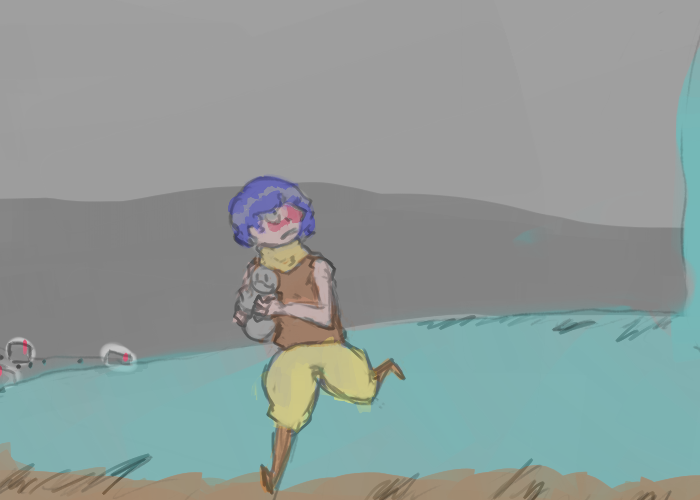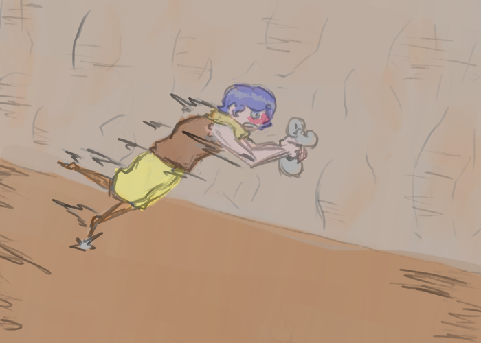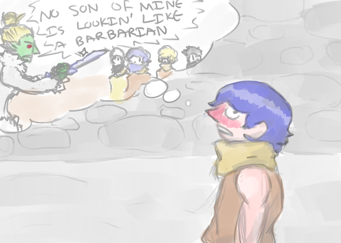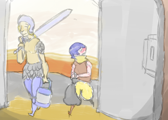 >"Ach, no difference now. We gotta go, the fort's gettin' ruined. I gotta head back to the trap tunnels an' see if Olin's okay, try rallyin' the guard.... Ye wanna stick with me? 'Dead dorves go best in pairs,' my pa always said..."