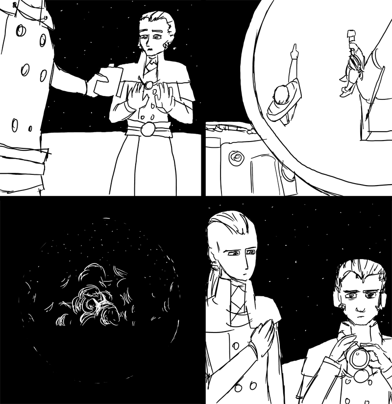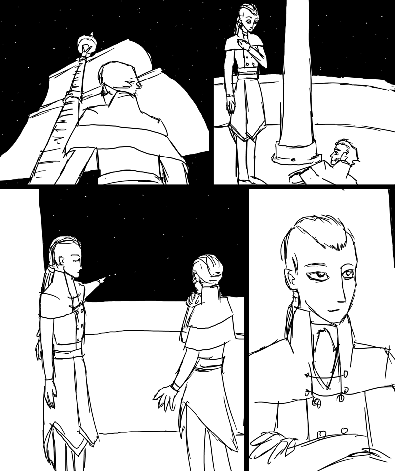 The lieutenant doesn't respond. She steps around and plants her back at the front of the mast, aligns herself carefully, and closes her eyes. Without looking, she raises her left arm and points directly at a bright star above. "Hermid's Eye," she states. She points her right hand up in the same direction and sweeps a long arc with it, ending with a finger pointing directly at a star more to the North. "Bride's Ring," she says, opening her eyes and checking her work. "Good. Means war in the ride line. All we godda do..." she closes her eyes again and points to the south with her left arm, two barely-spread fingers aimed squarely at two dimmer stars to the south. "...is keep the Southern Dwins ride there." She opens her eyes, looks down her arm, and smiles subtly. "They're gonna make a circle ride there undil the sun, long as Rockwell keeps us poinded this way." Her eyes seem to unfocus, a contented expression on her face as she gazes off into the horizon.