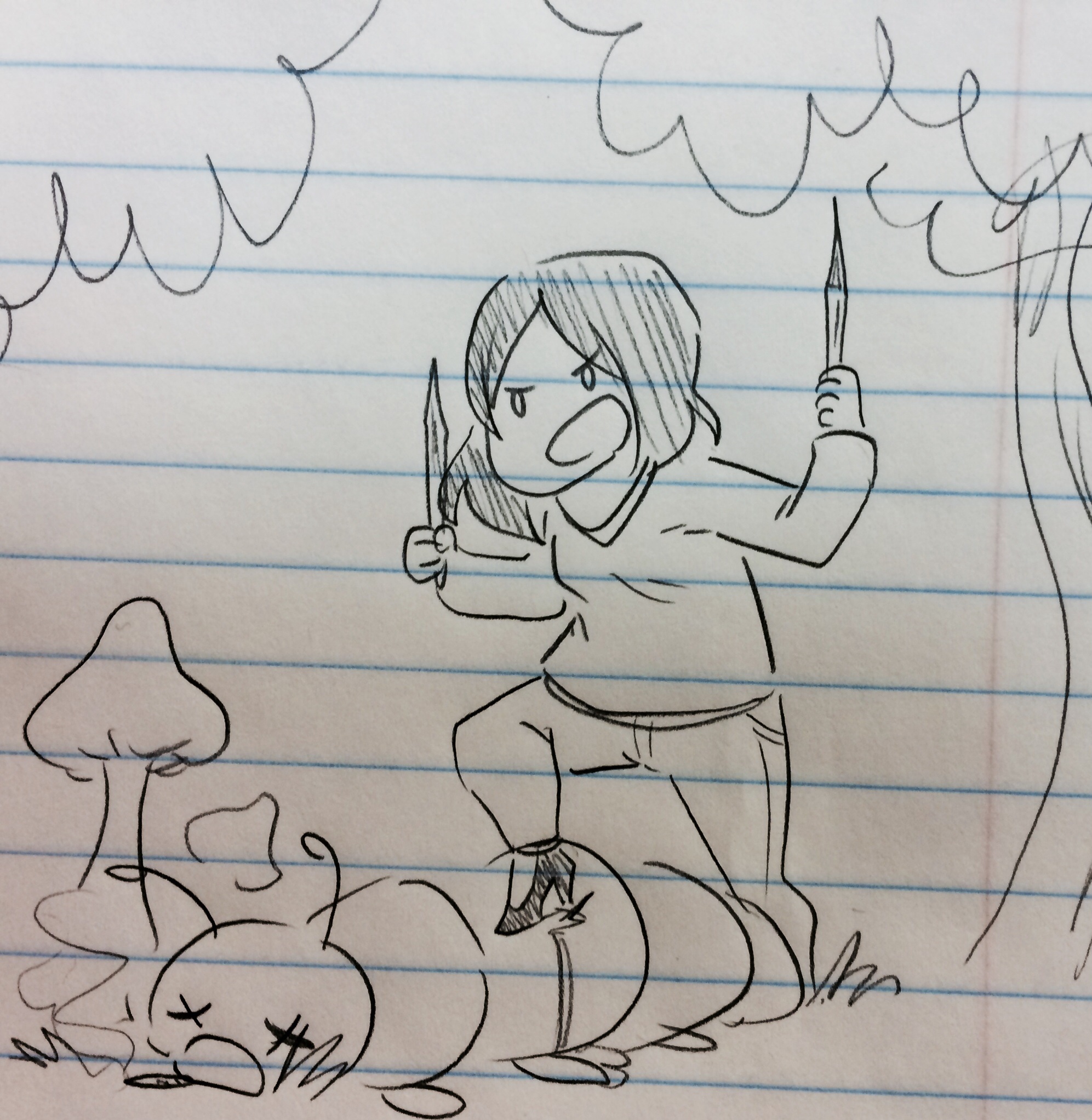 That's right... I AM MY OWN KIRITO! Quickly, I grab another stick and fashion it into a shank for A DOUBLE SWORD COMBO! Boom! That caterpillar is DEAD. Eh....there's nothing to loot but a half-smoked blunt, though...