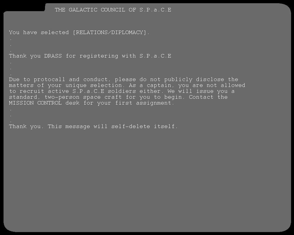[The act of recruiting S.P.a.C.E members is heavily discouraged due to code of conduct. S.P.a.C.E believes in the harmony of all forms of life in the galaxy. Therefore, the force actively works to include as many as possible. Newly promoted captains, as such, have been excluded from the option of taking in their own peers and comrades.]