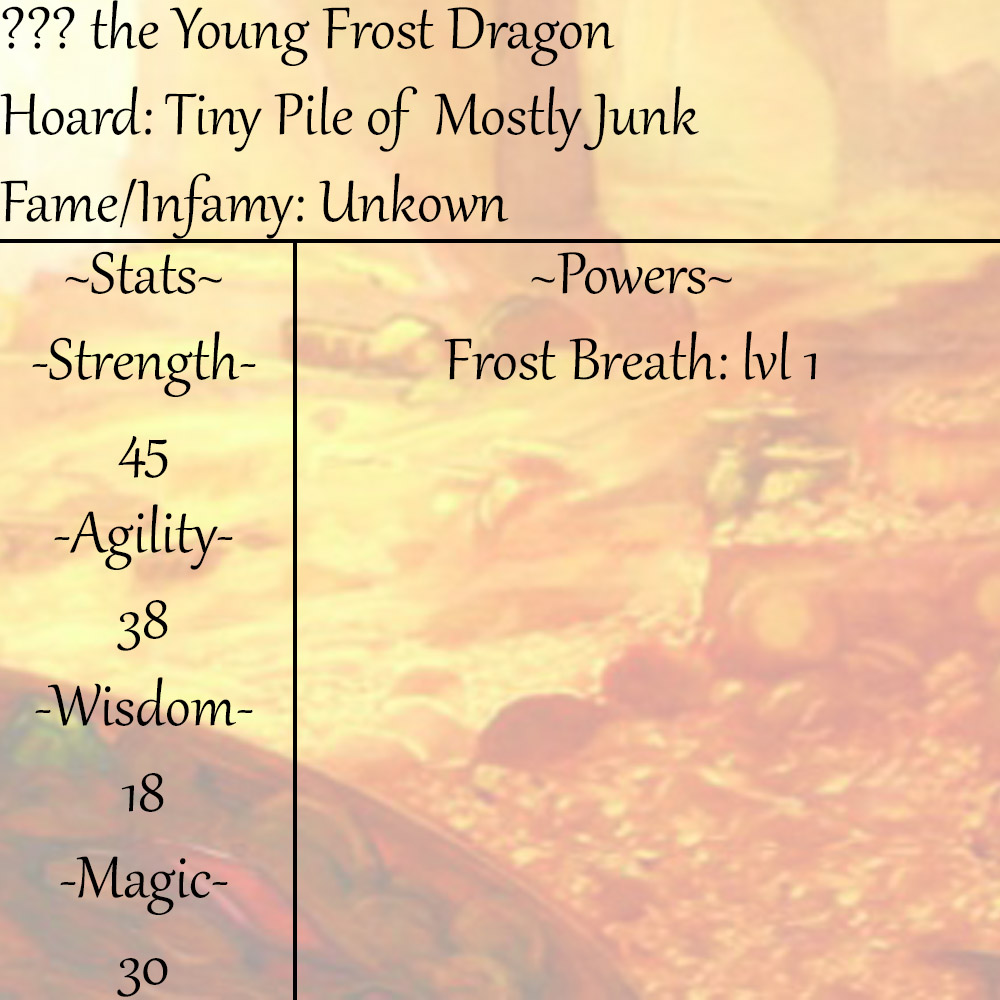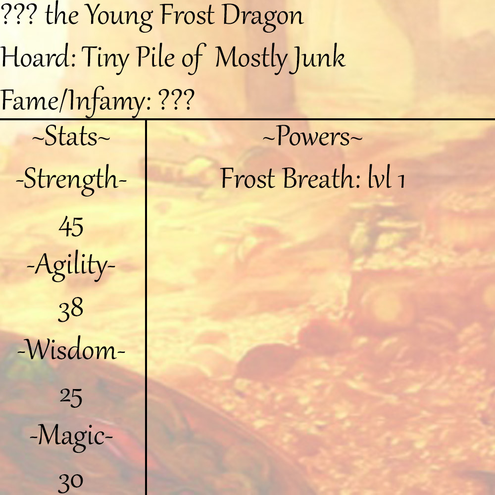 Several of your brothers and sisters burst from their shells not long after you, the noise attracting the attention of your MOTHER. Your MOTHER takes care of you and your siblings for several years, protecting you as she teaches you the basics of being a DRAGON. You learn to hunt and scavenge, how to properly stack your treasure, speak, fly, and use your FROST BREATH. Eventually you grow old enough that your MOTHER no longer needs to constantly keep watch over you and you have your first little bit of freedom.