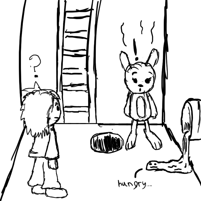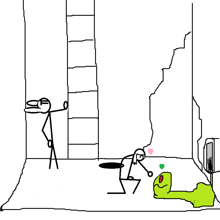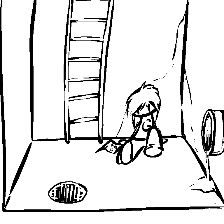 G attempts to befriend the slime creature, the slime is now befriended. No one had ever show it kindness before so instead of devouring the prisoner like ordered it now hungered for companionship. Meanwhile 'Bunnykins' peers up the ladder to find that there is a opening at the top, wherever it connects to appears to be well lit.
