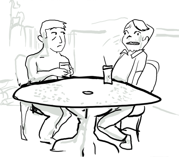 You offer to join him in the restroom and he seems to accept. Pretty sure he's pouting though.