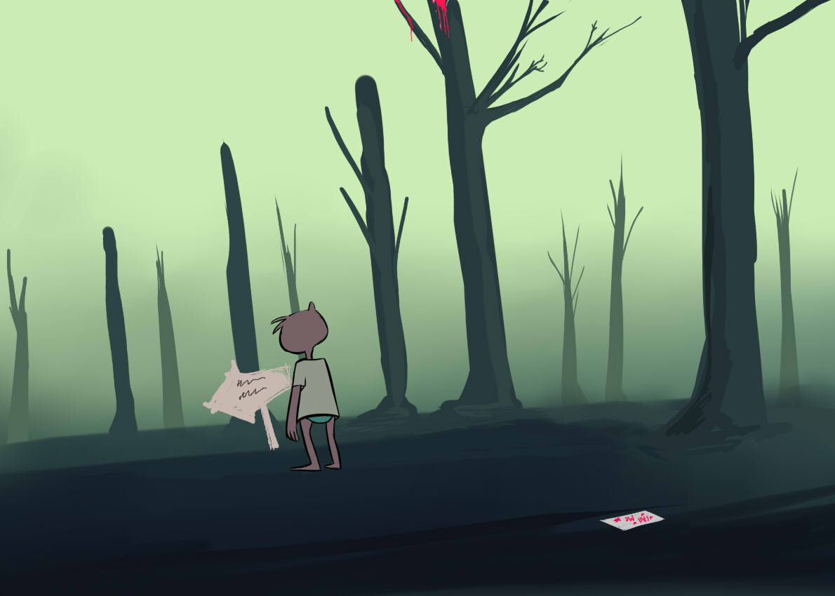 He wake up in a desert place filled with dead trees and a strange feeling of sadness.