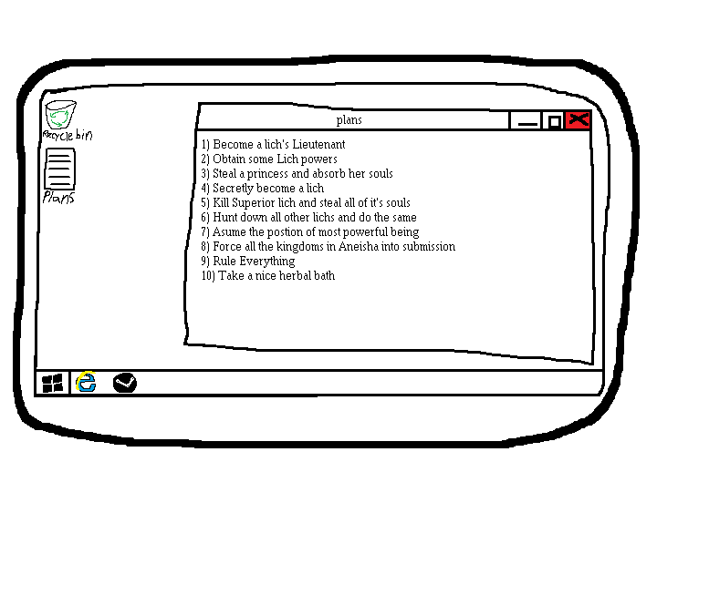 Update facebook status to "waiting for brave knight to rescue me from Evil Lich's Tower." E-mail plans.txt to your parents, with the subject line "found this on Evil Lich's compy"