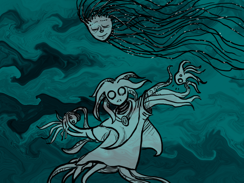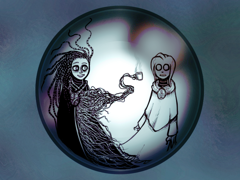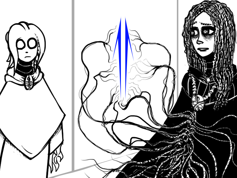 “Why kill dat many people?” A thought occurs to me as I glance into the ocean around us, and the glass orb we’re inside of. “…Am I correct in tinking dat, on ‘dat one night’, you ritooally ‘akrified all of dem to variuh apect of reality for favor?”