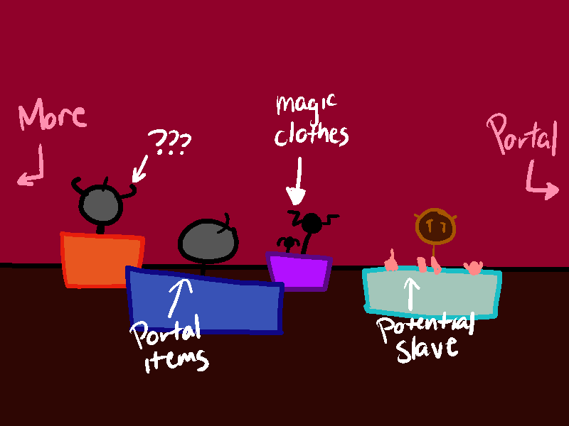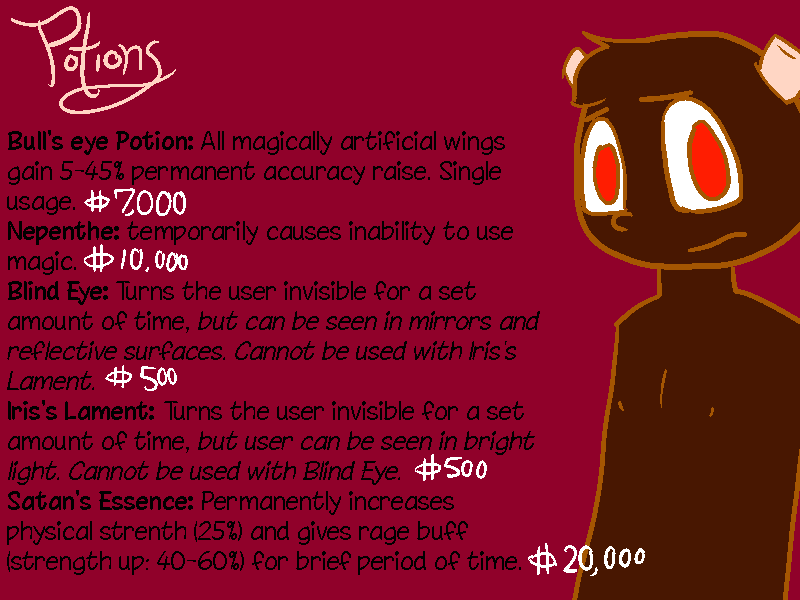 "-- sasaypi with the yellow stand sells pretty general armor an' weapons. Dunno if it's junk. The demon in the green box, he sells crap. Over priced crap. Bought some potion ingredients from 'im -- they were FAKE. That cherub; he's new around 'ere."