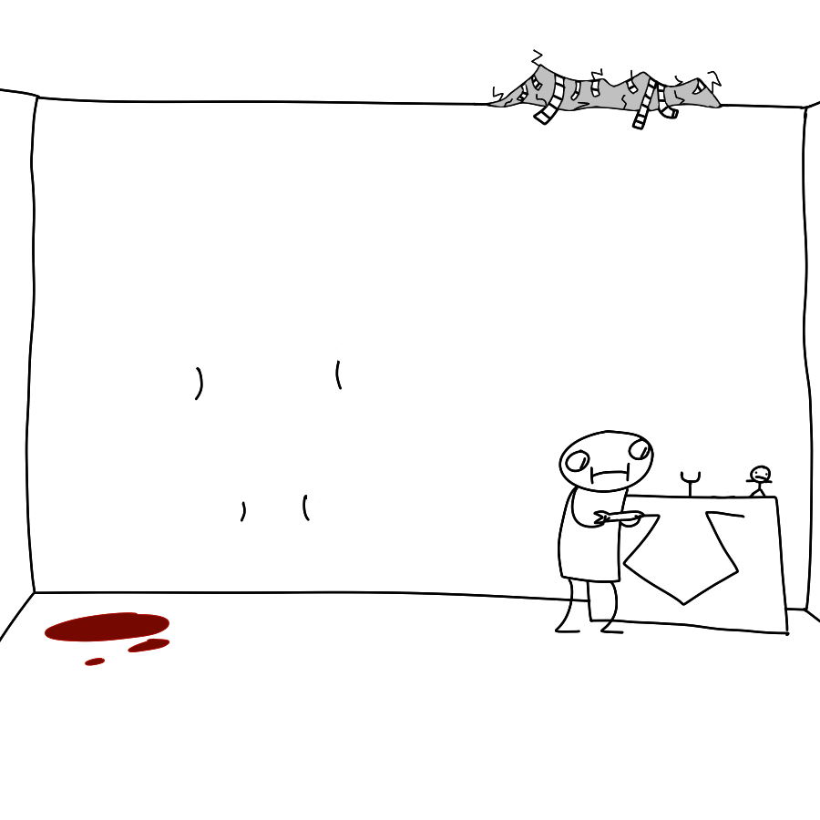You wake up attached to the wall like Jesus in a room with no doors or windows and all you can see is a blank wall,what seems like dried blood and a table with various objects.