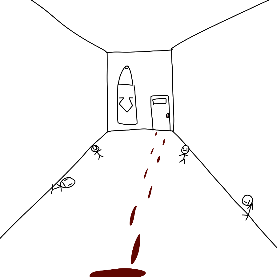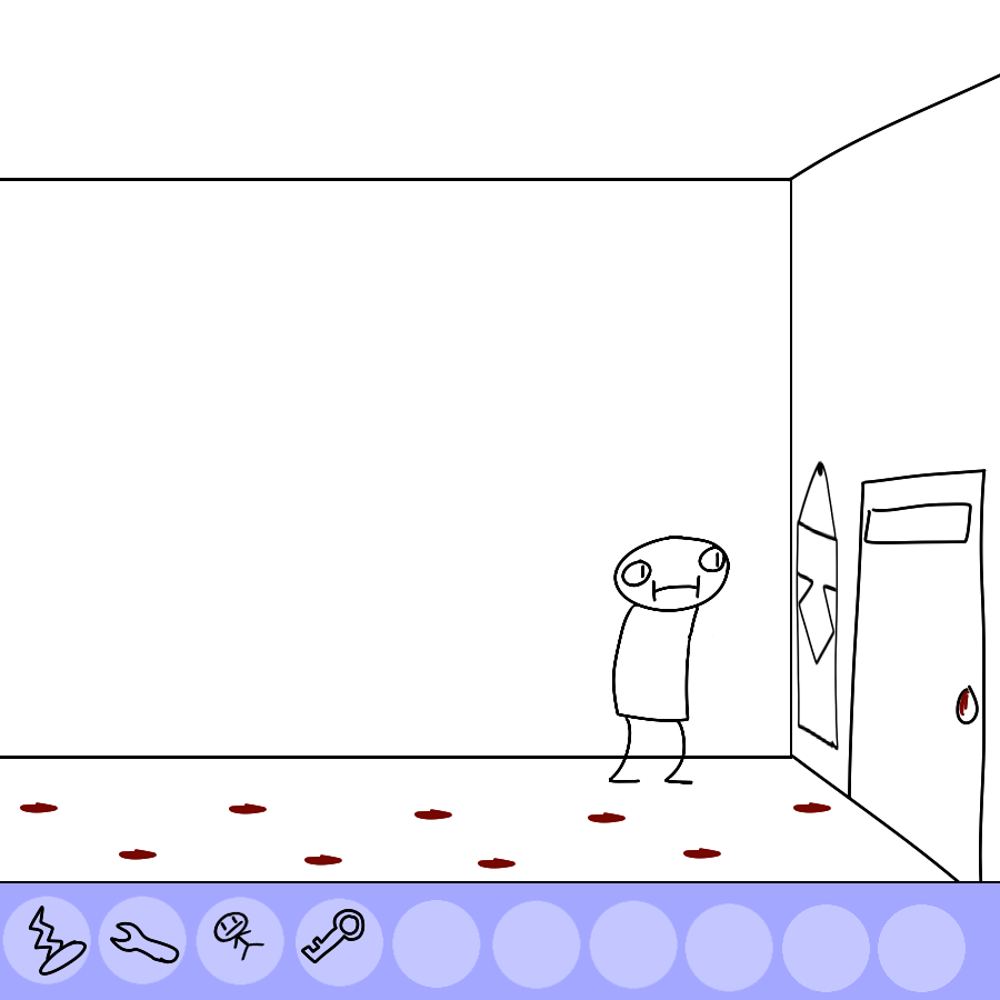 You look at the hallway at the "things" which look like more dolls,a door,bloody footsteps and a banner with the strange symbol