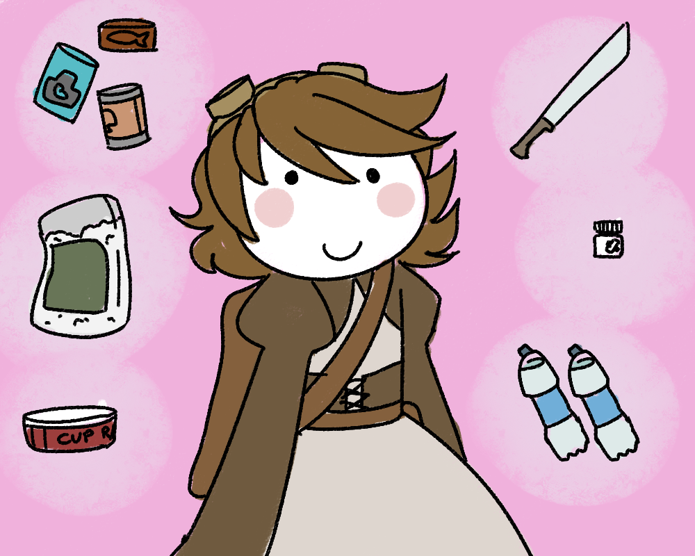 My bag now contains a bunch of canned food (two of each mushroom soup, tuna, gross beans), a bag of rice, instant noodles (useless?), a cool machete, two large bottles of clean water (extremely valuable!!!! though they're kinda warm) and some painkillers (probably good??). It’s kinda heavy but I'll be fine.