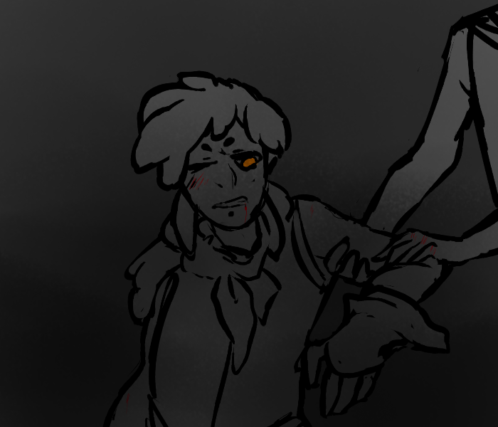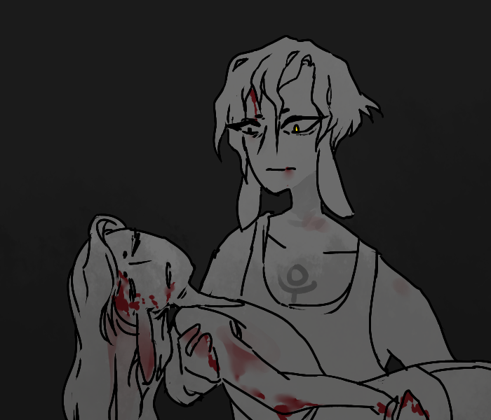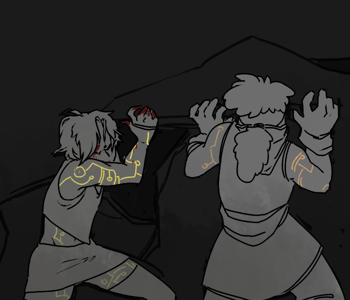 Even though Mikado is much larger and Maroon's arms feel hollow and shaky, they manage to lift the elf and they lay them carefully on the floor. Goldie emerges again, carrying the much smaller Flax in their arms. Both Chargers are battered and bloody, and one of Mikado's arms is bent at an unnatural angle that makes Maroon's stomach lurch.