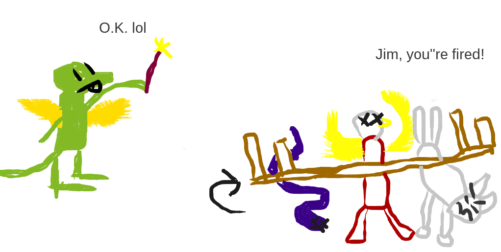 >>681072 You flip the table over onto your coworkers with the power of your magic wand. -100 Office respect points -50 Happy Friendship points Bob the snake and carol the harpy eagle are knocked unconscious, Peter promptly fires you.