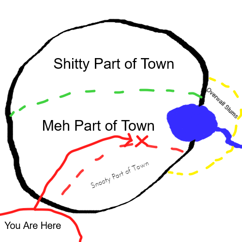 Problem is, you're right in the middle of town, and every way you look there's serious issues with getting this stuff out. For one thing, you can only carry two bags at once, for another every lizard in town is going to fight you for it every step of the way, and aside from all that if you want to take the fastest route out of here you have to cut through the nicest parts of town, and you haven't bathed in a month.