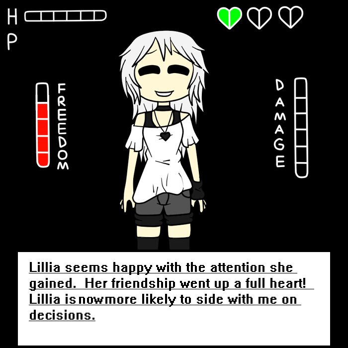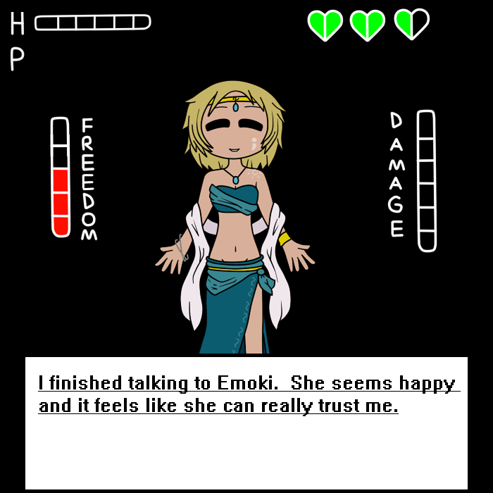 Finally, we move onto the "freedom gauge". In Play Escape, you are forced to choose based on choices that are given in the white text box. For each choice you submit, the gauge goes up. Once your freedom gauge is full, you will be notified, and allowed to submit a "free response" where you type ANYTHING and it has the possibility of happening, even killing a character in one go. When your freedom gauge is full, each response that is generated will be put through a randomizer and the top one will be the act enacted.