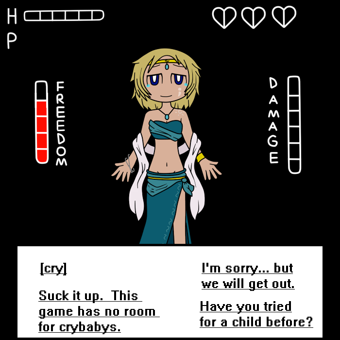 So the hearts are a conversion/capture meter, the right bar is the enemy's health bar, and the left bar is the limit breaker, which in our case allows us to suggest ANYTHING and it has a small chance of happening, we can kill enemies that we have befriended, but we get marked as Backstabbers.