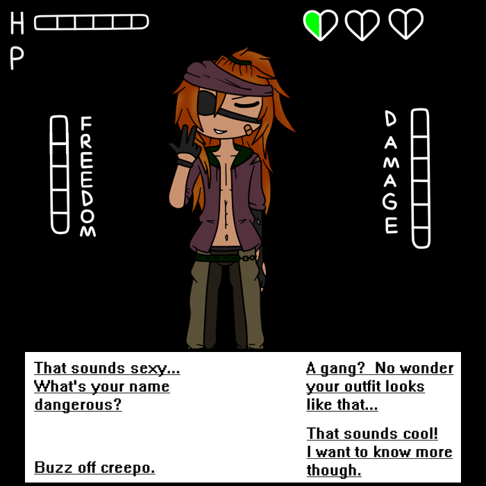 TOXIC: "Hmhmhm. A good question indeed. As mentioned before I am the leader of a gang. We had a pretty big goal to take a princess hostage and demand the Duke money for her back, however, as it turns out, she was pretty crafty herself. She used a shard off the ground to cut her bindings and successfully rid me of one eye. Unfortunately she got away, as I was pretty much blinded by blood."