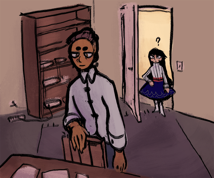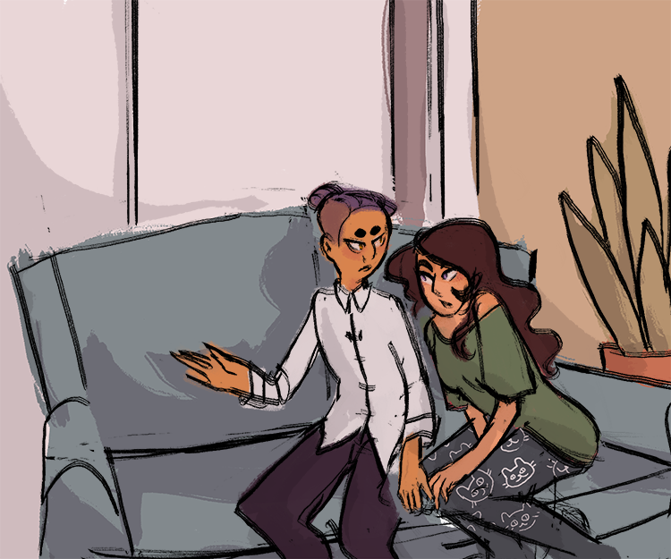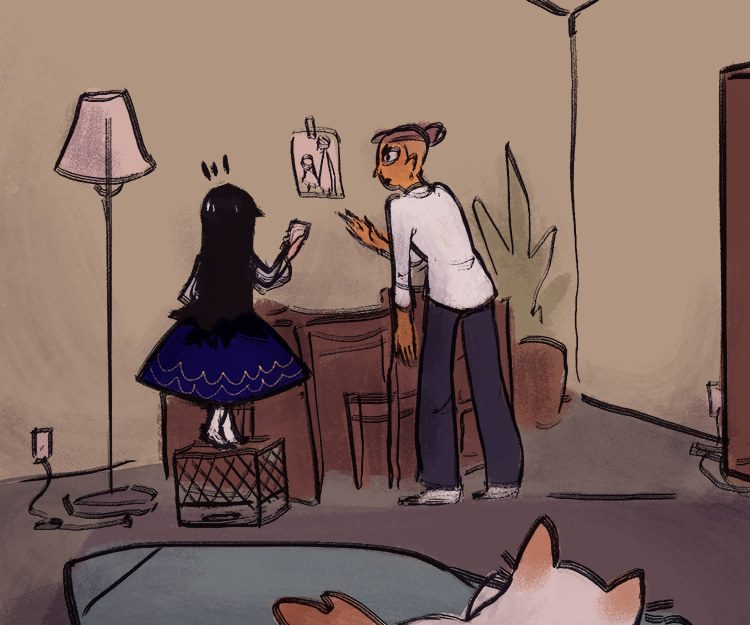 well, its good to be back. despite the fact that your problems seem to be literally following you, you refuse to let it win in your own space. you throw off your jacket and your shoes and collapse on the couch. the kiddo follows you and sits delicately on the couch's armrest. he doesn’t take off his shoes.