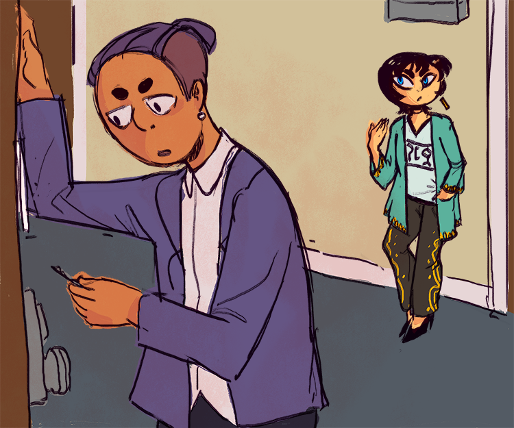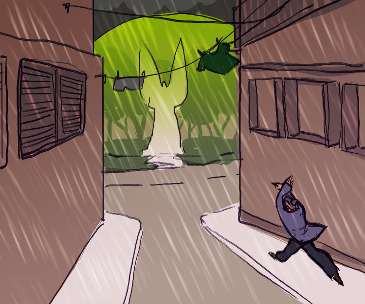 he’s not buying it. “i apologize if i scared you. i thought it might be better to wait outside, but then, well, the rain. and i’m not exactly waterproof right now. what an awful time of year to do hardware adjustments.”