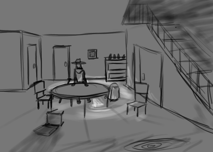 Main Hall: This area is pretty wide open, and a good place to confront the beast. The middle of it is dominated by a dining table, and under the stairs is a closet. This room connects to every other room on the ground floor. The stairs are guarded by a railing. The north end of this room is home to a coat rack and a place to put shoes. It also tended to be used as a storage area for random stuff, but there's nothing there now.