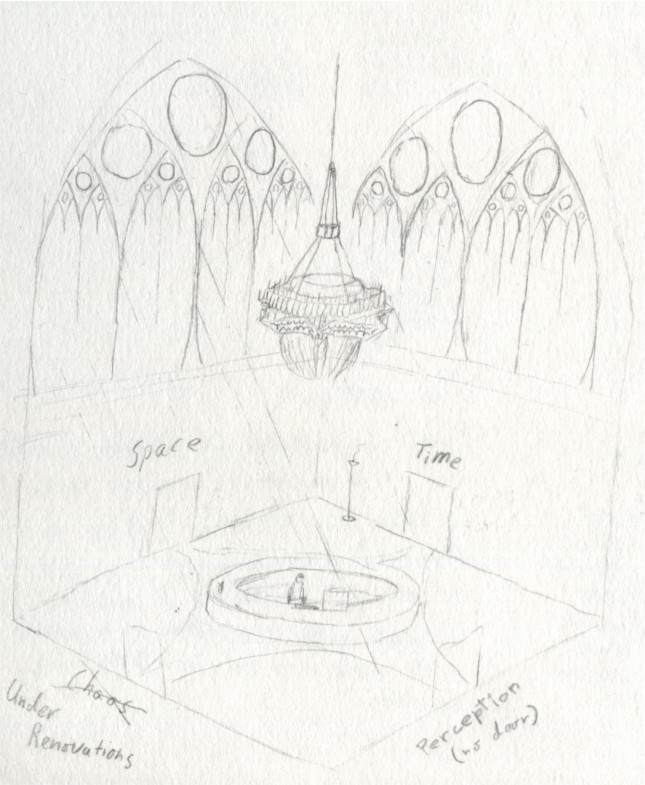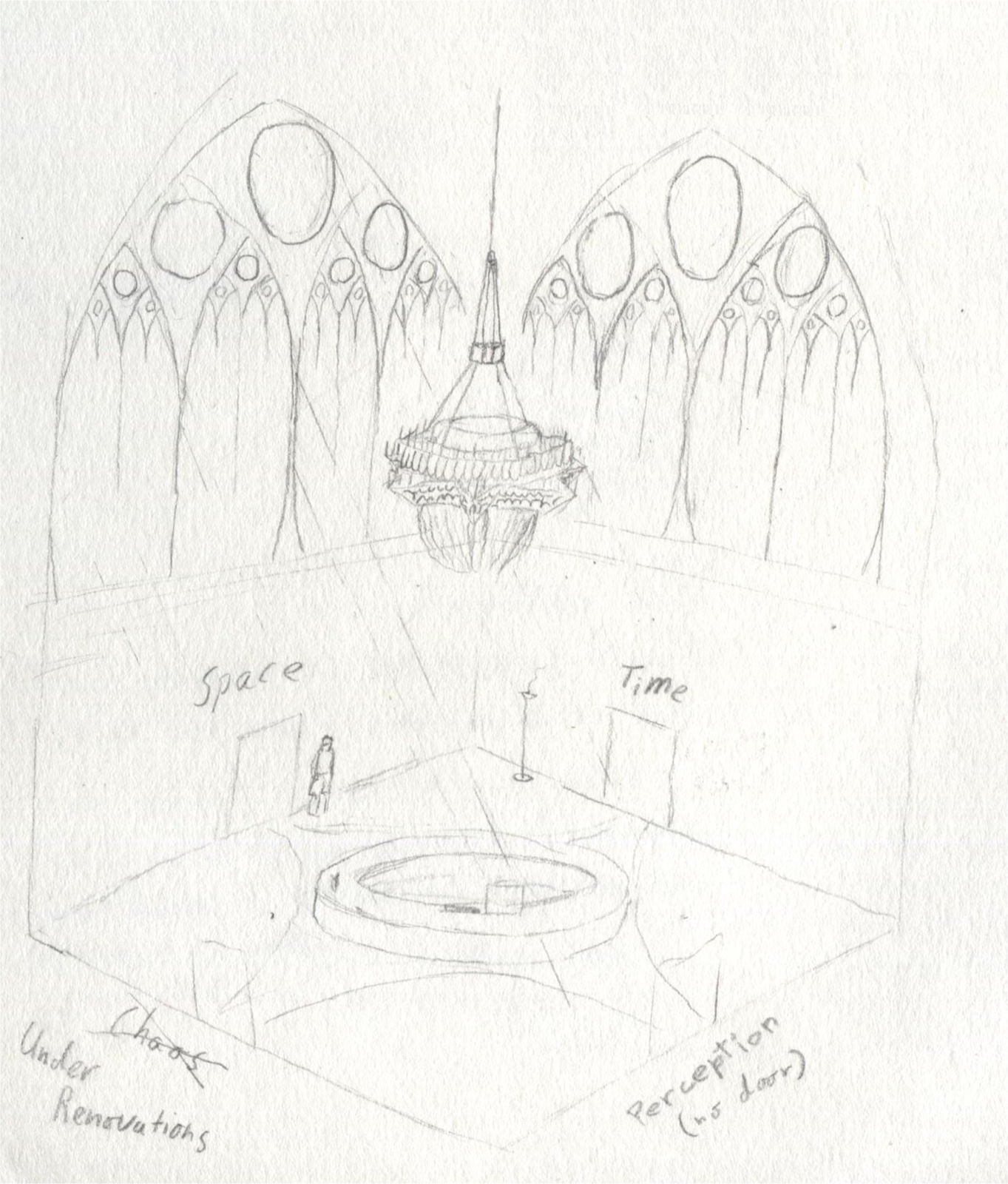 from here there are doors to exhibits labelled "Space", "Time", "Chaos" and "Perception".
