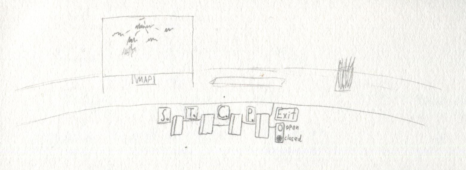 there's a stack of leaflets, some pens, some slots for key cards under the table and a blank tile labelled "Map".