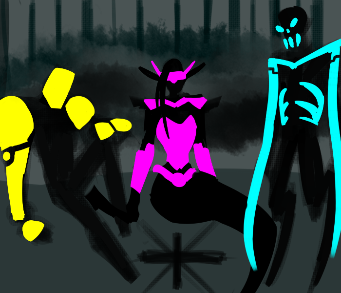 You stand near a FIRE ready to be lit, three inky silhouettes face you expectantly