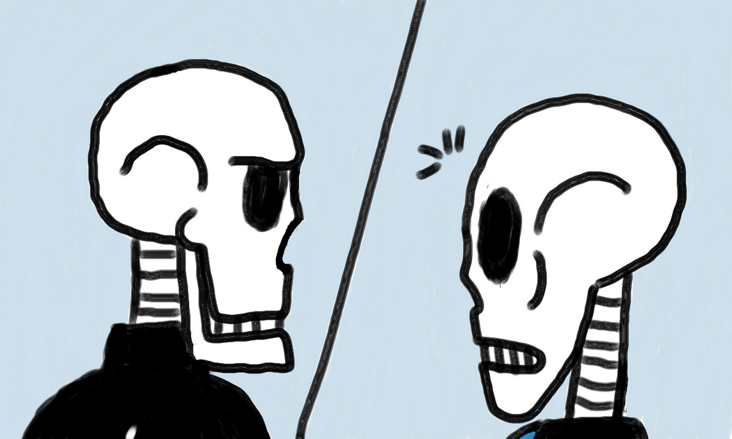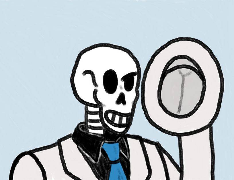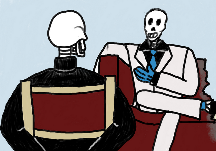 “Heh, blunt. And rude.” He leans forward a bit. “A word of advice, kid. Don’t ever repeat any of that. People can get overly sensitive about such things. ‘Undead’ is what you’d call an abomination that terrorises the living up there. The preferred term is ‘afterliving’. That’s no pun, mind you. And yeah, we’re all bonebags here. Don’t worry, you’ll learn to differentiate people eventually, some more easily than others.”