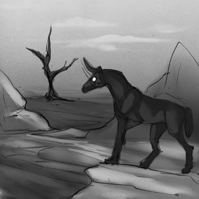 You turn south, your hooves clattering on the rocky landscape. Puffs of dust burst up, lingering in the air for a moment long after you've moved on.
