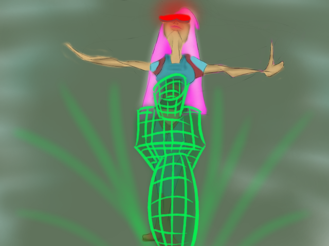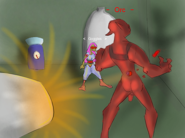 This dungeon should probably have stuff my level. I'm on a ledge. It's hard to see what's below because of that weird luminescent waterfall's mist could, but there's definitely an orc down there. Looks like a video screen of some kind, too. I could probably slide down the waterfall, or take that lift just after it. There's also a box up here.