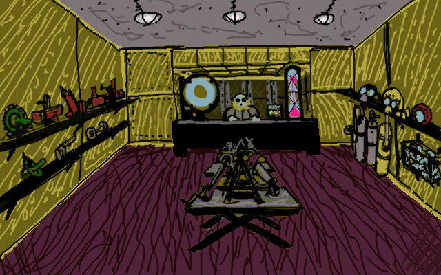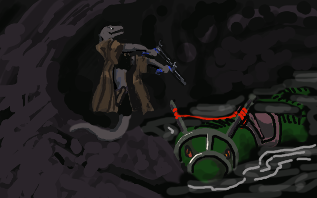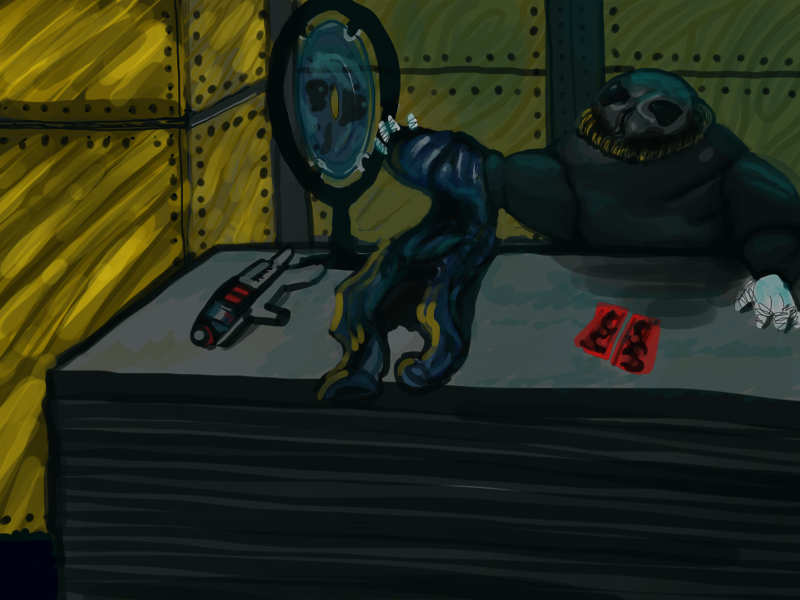 A borrocka, a race that I'm used to seeing as a lowly slave worker, stands behind a desk on which instruments of unknown function occupy half the space. He greets me with reservation in underdrought common speak and welcomes me to his butique. He doesn't move and seems to stand erect ready to maybe grab something from under his desk.