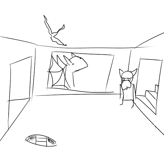 There's a door to the opposite side, a manhole in the southwest corner, and a dragon painting on the north wall.