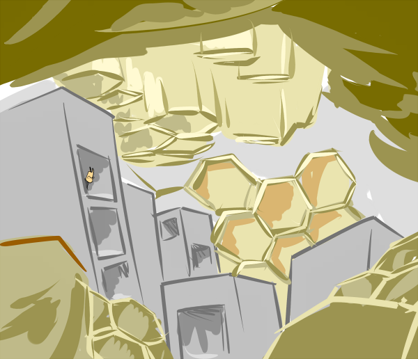 He goes back to his workstation and starts tabbing through windows of very incomplete looking images and files.