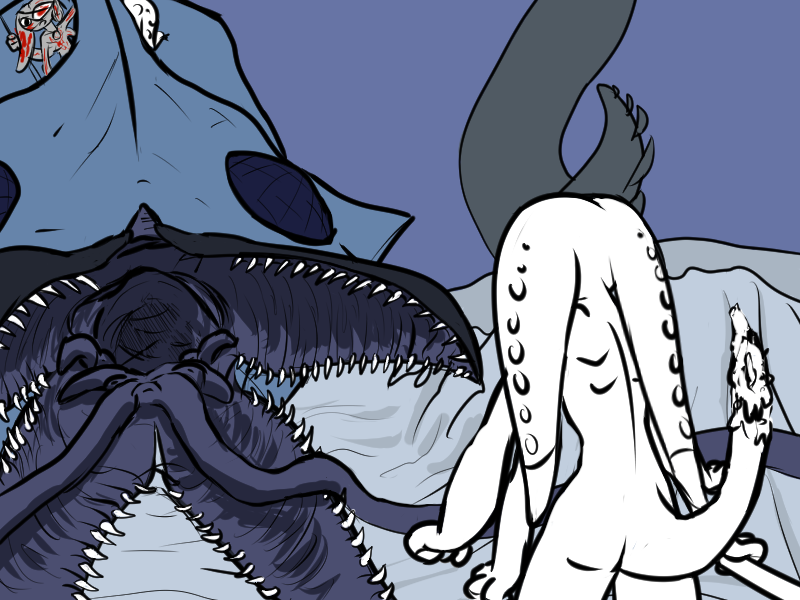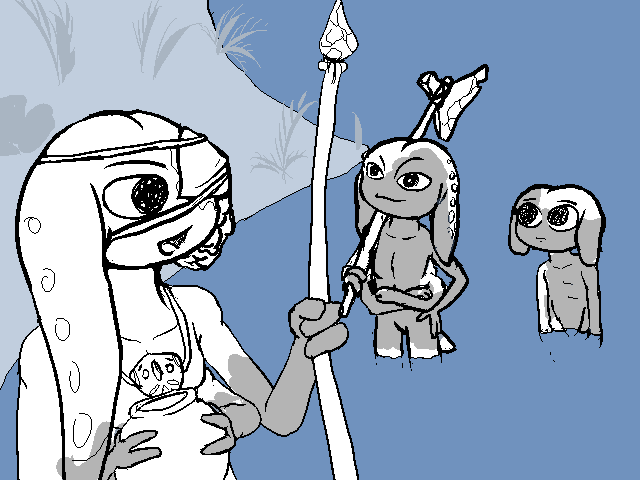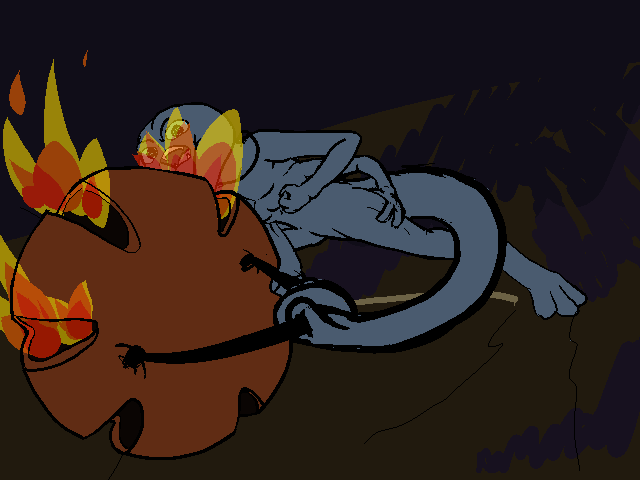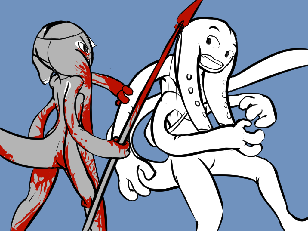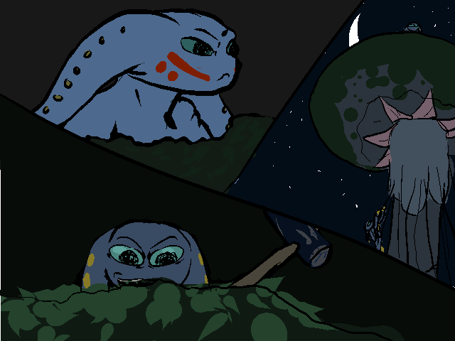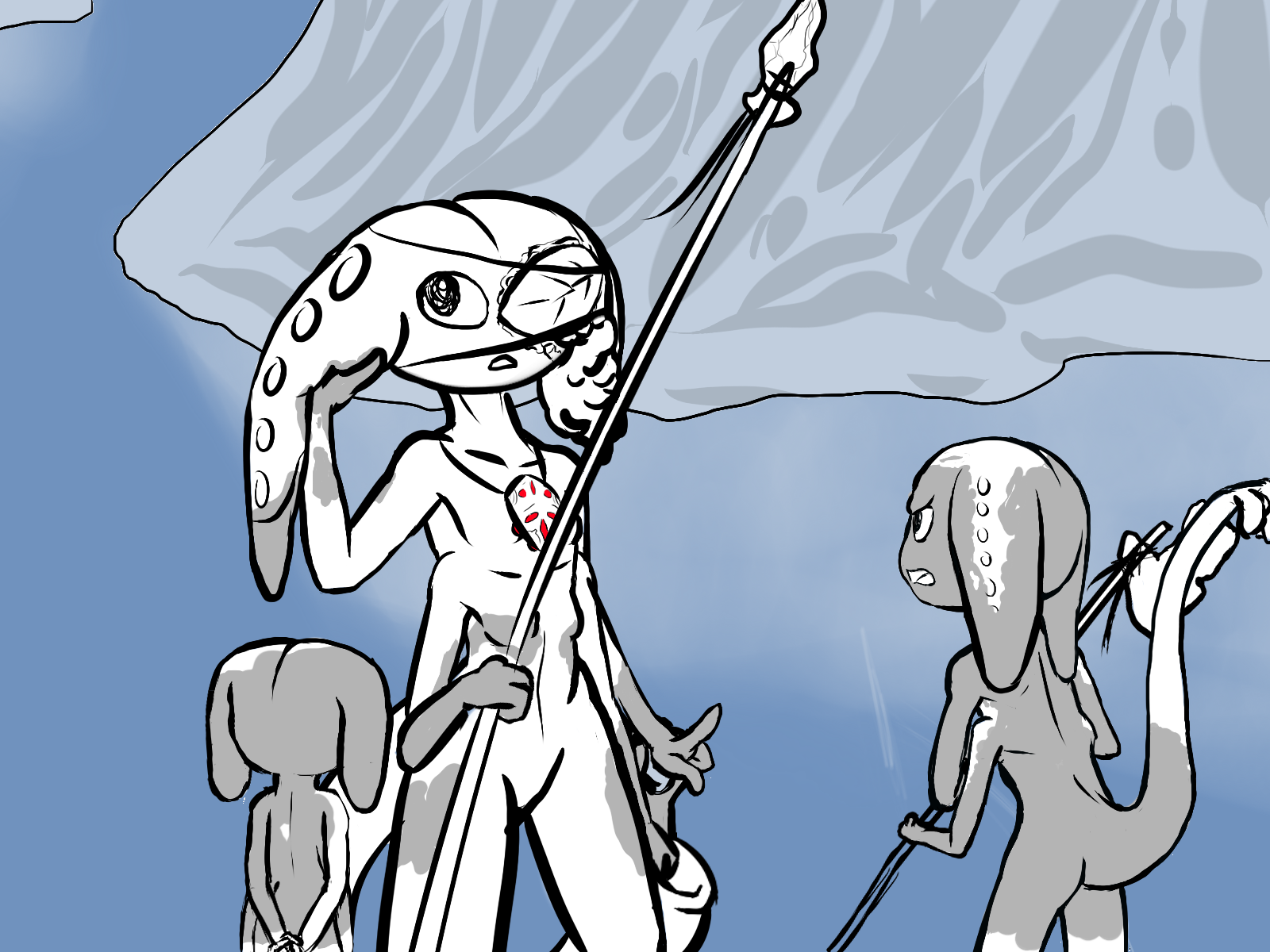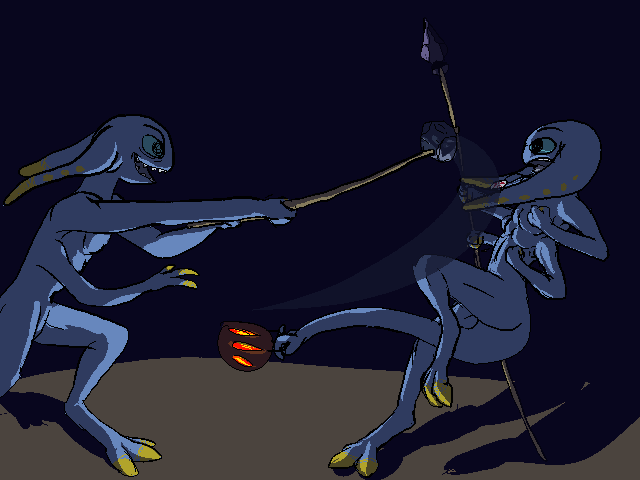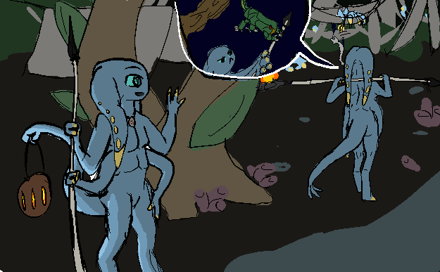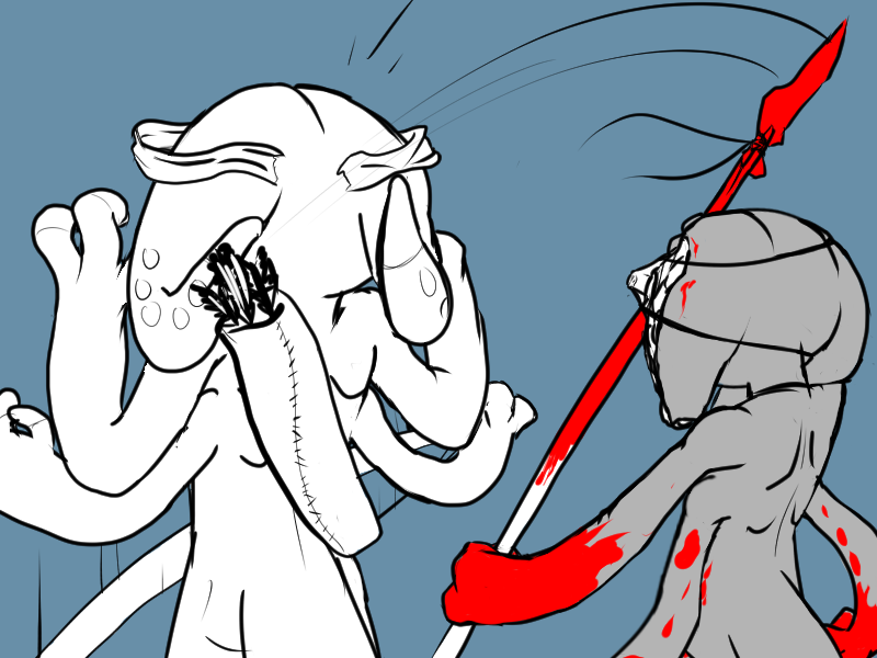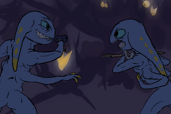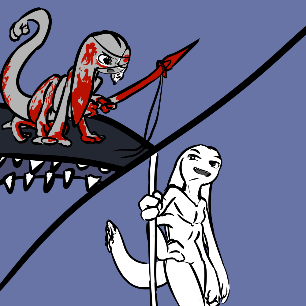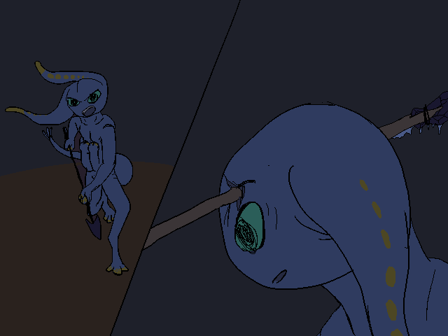 "It's just my tail," the one with the spear replies. "I'll be- Behind you!"