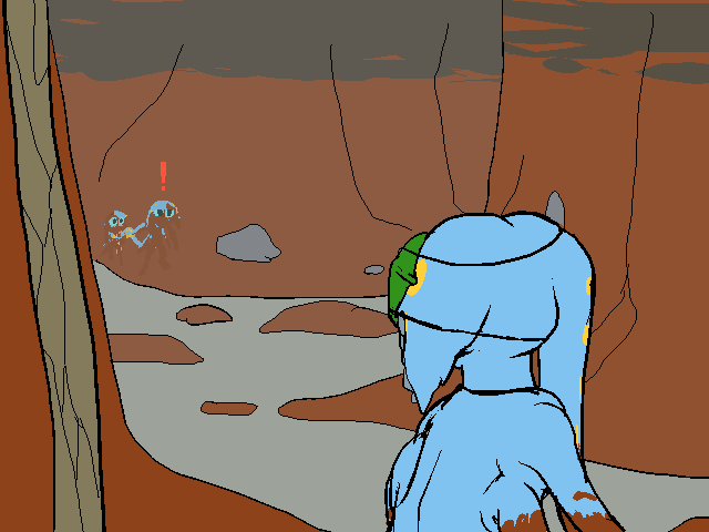 "Ah, um. Your voice, and how it sounds like you're talking to nobody. It's Nies behind me, ri-" I cut him off before he can finish, grabbing his shoulder and turning him to face me. The archer stumbles for a moment, catching himself before falling from the slizer's back. We both look each other over. "I-it is you," he joyously exclaims.