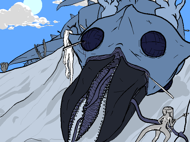 The archer, hesitates as I slide along the great worm's face to the upper mandibles, shouting "settle down, Reimei," to the person below.