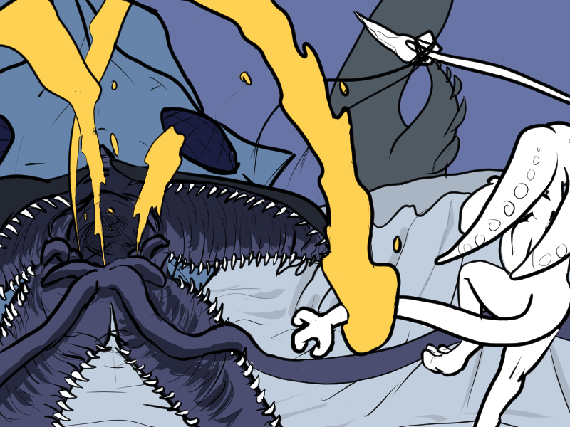 With only that briefest of warnings, it unleashes a stream of caustic spittle. From below, a scream pierces the air.