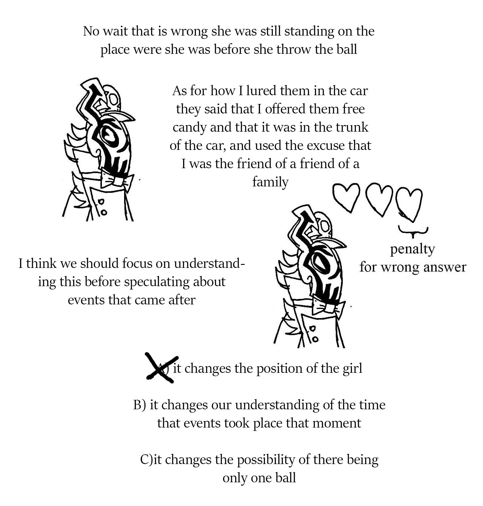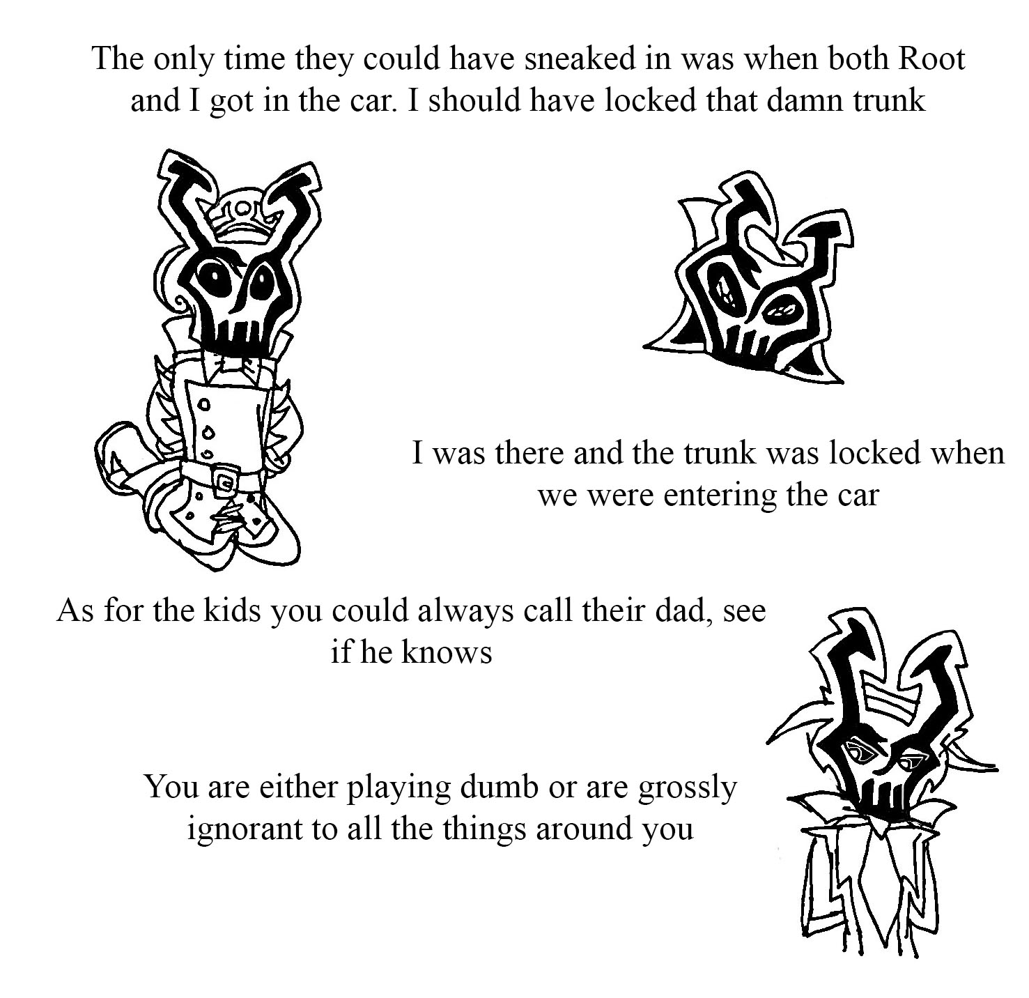 When we opened the trunk, we did it because we asked Lazlo if he wanted any chips or a snack because we also had groceries in the trunk. Now here's where there is an inconsistency with the kids story. They would probably say that they broke out and me and Lazlo were just standing there, because honestly, what kidnapper forgets that they have kids in their car? And wouldn't this technically make Lazlo an accomplice to the crime? Just saying.