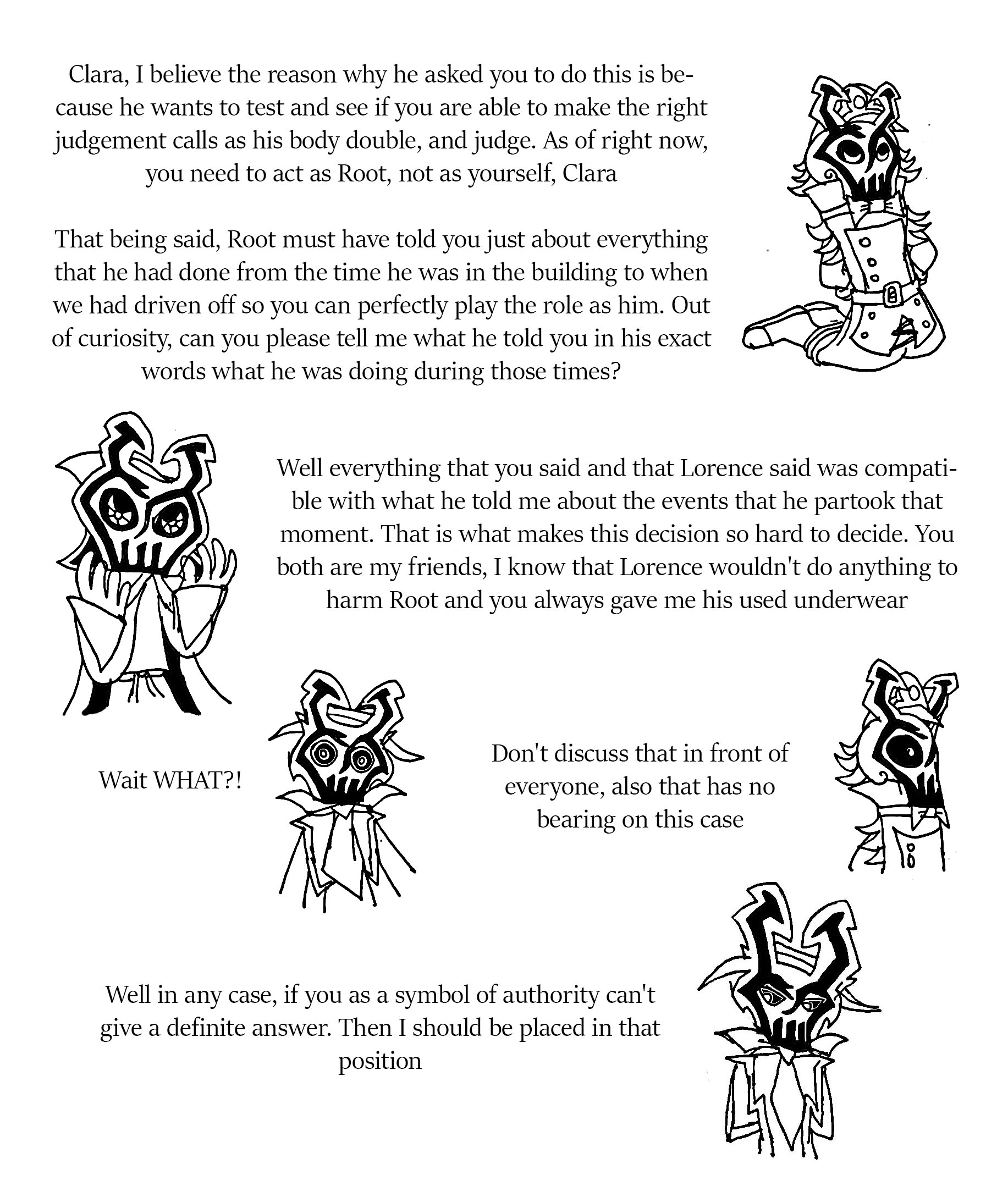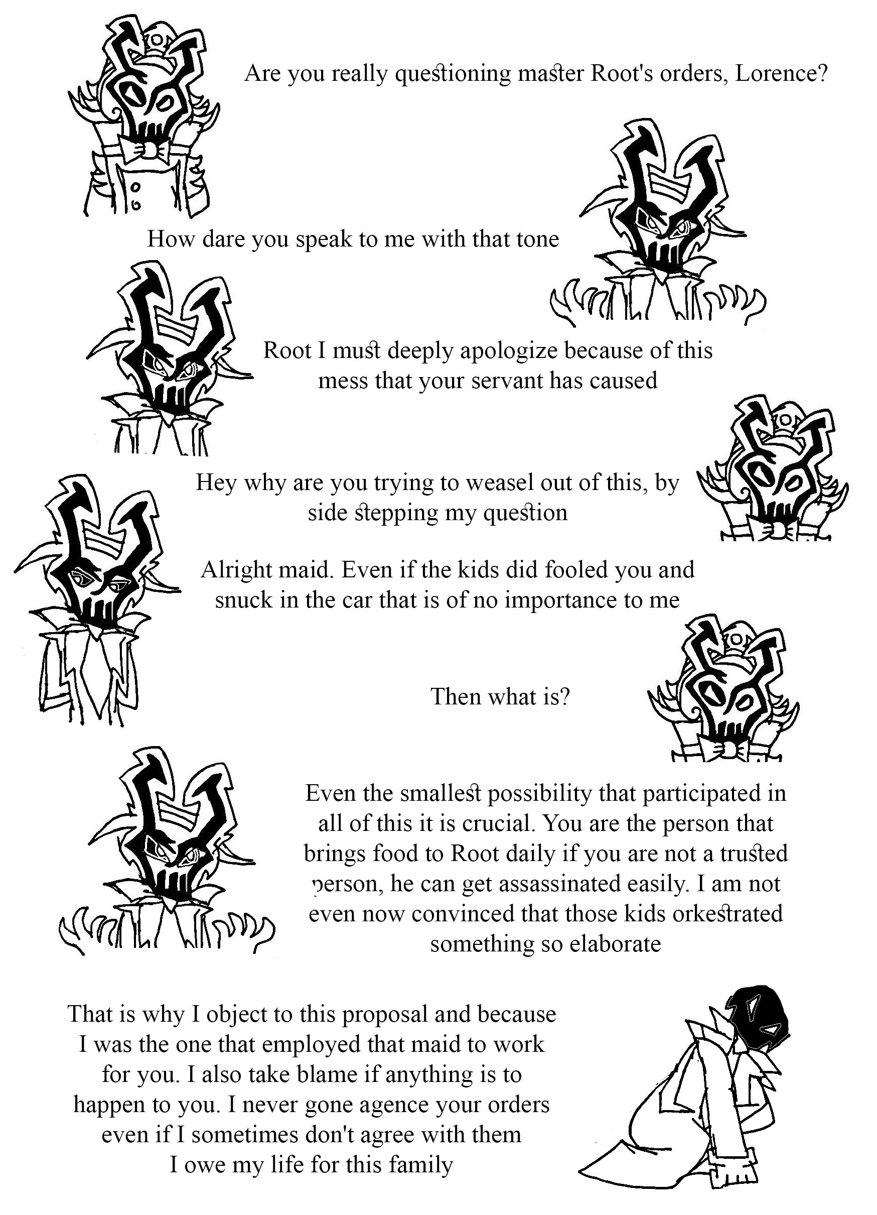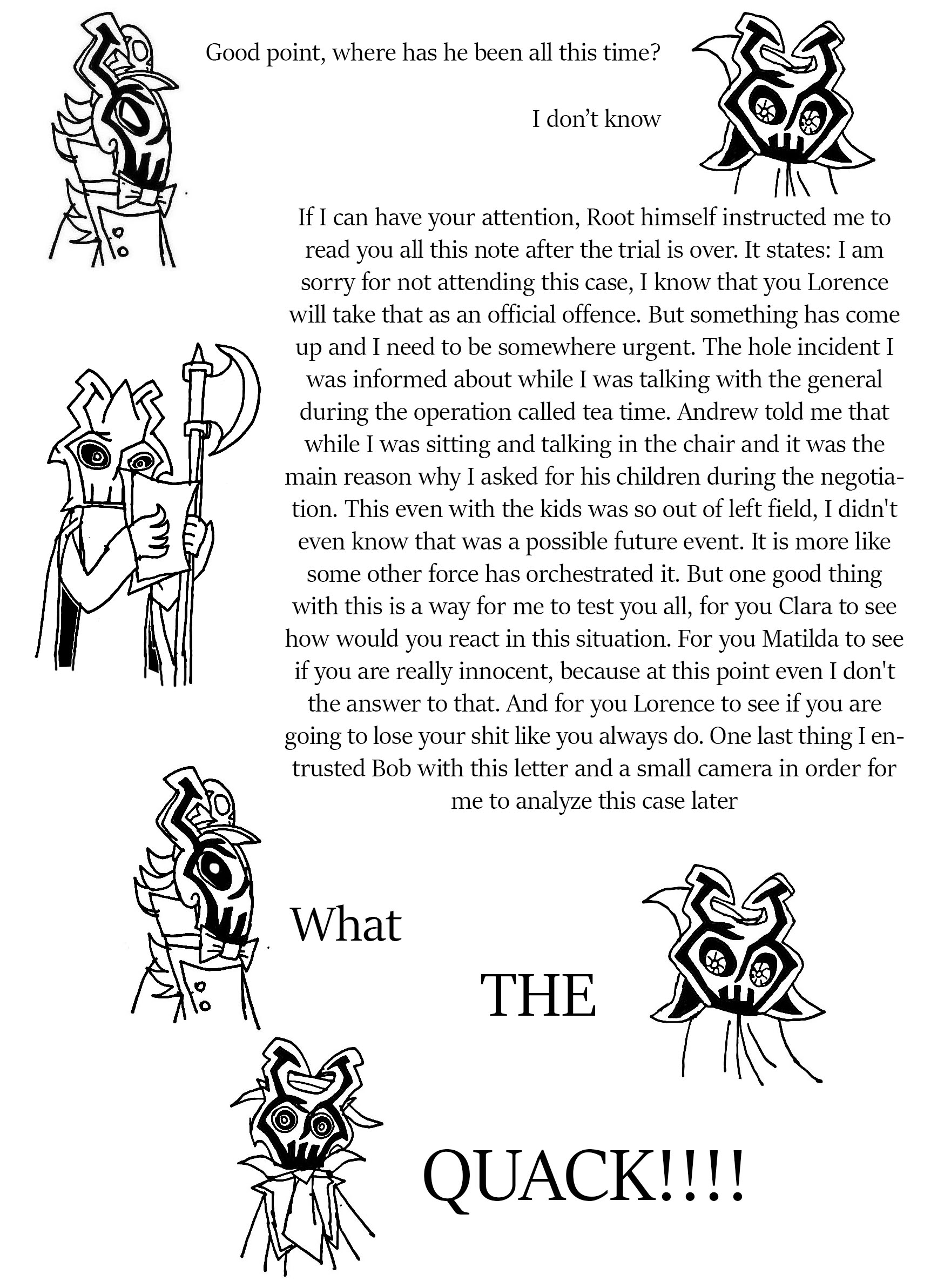 After that you were greeted by Lorence and Lazlo, Root went off to go plot the start of the siege. Lorence stayed behind just a bit to lecture Lazlo before heading off, so he could have heard the kids say "Surprise!" Maybe, maybe not.