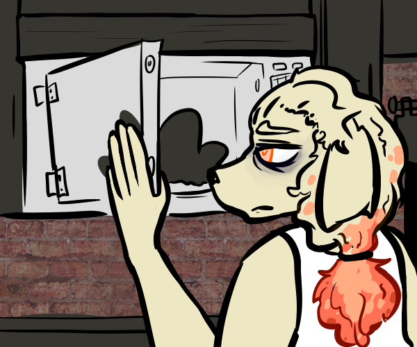 Your fridge is pretty barren, but you find something to eat. It's something Echo made, last weekend. It's... probably edible. You think. You didn't die the first time you ate it - that's a good sign. You put it in the microwave.