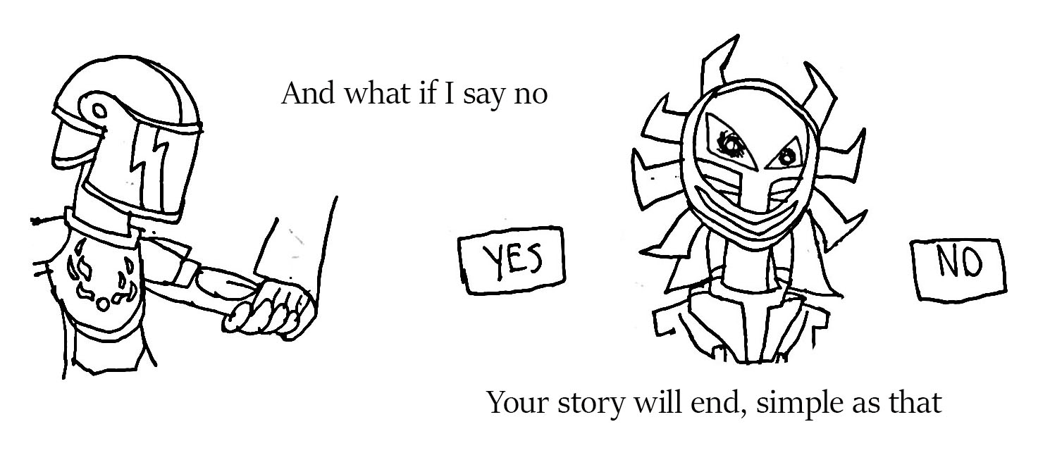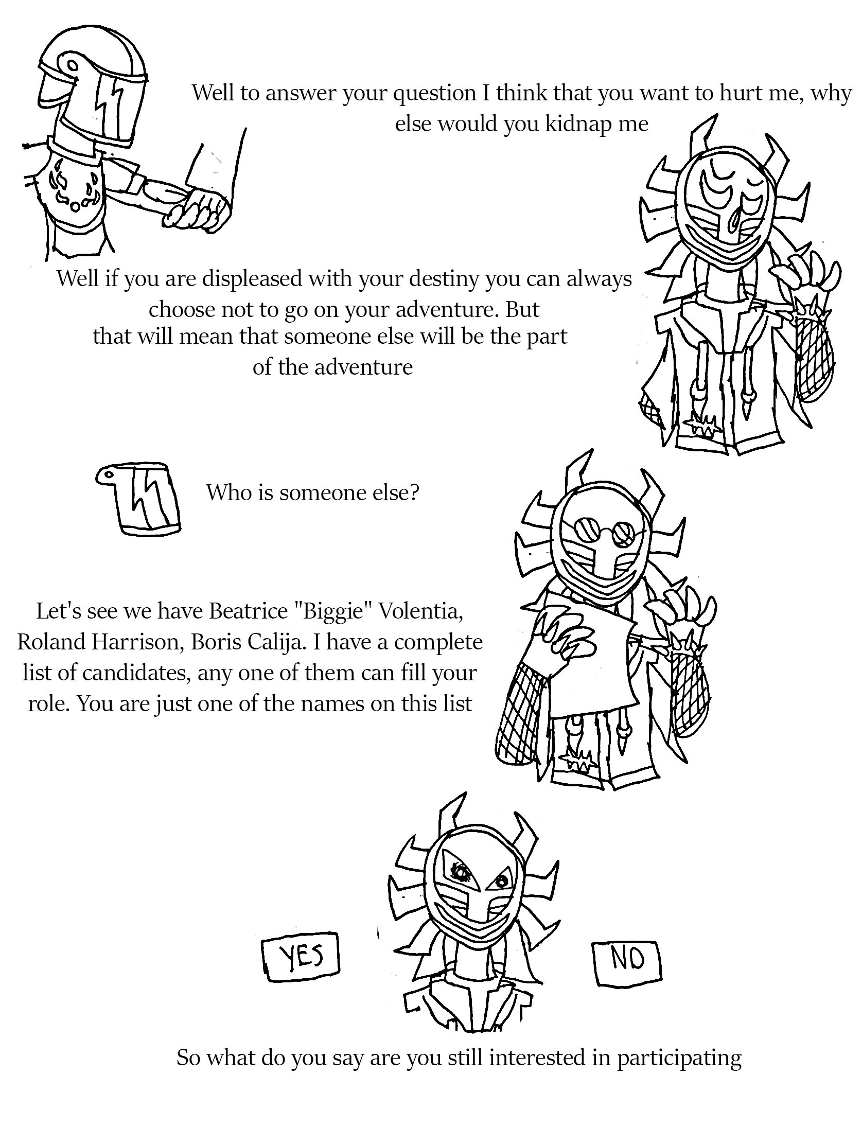 Story will end... As in your life will end? best to do what he says for now. Say yes.
