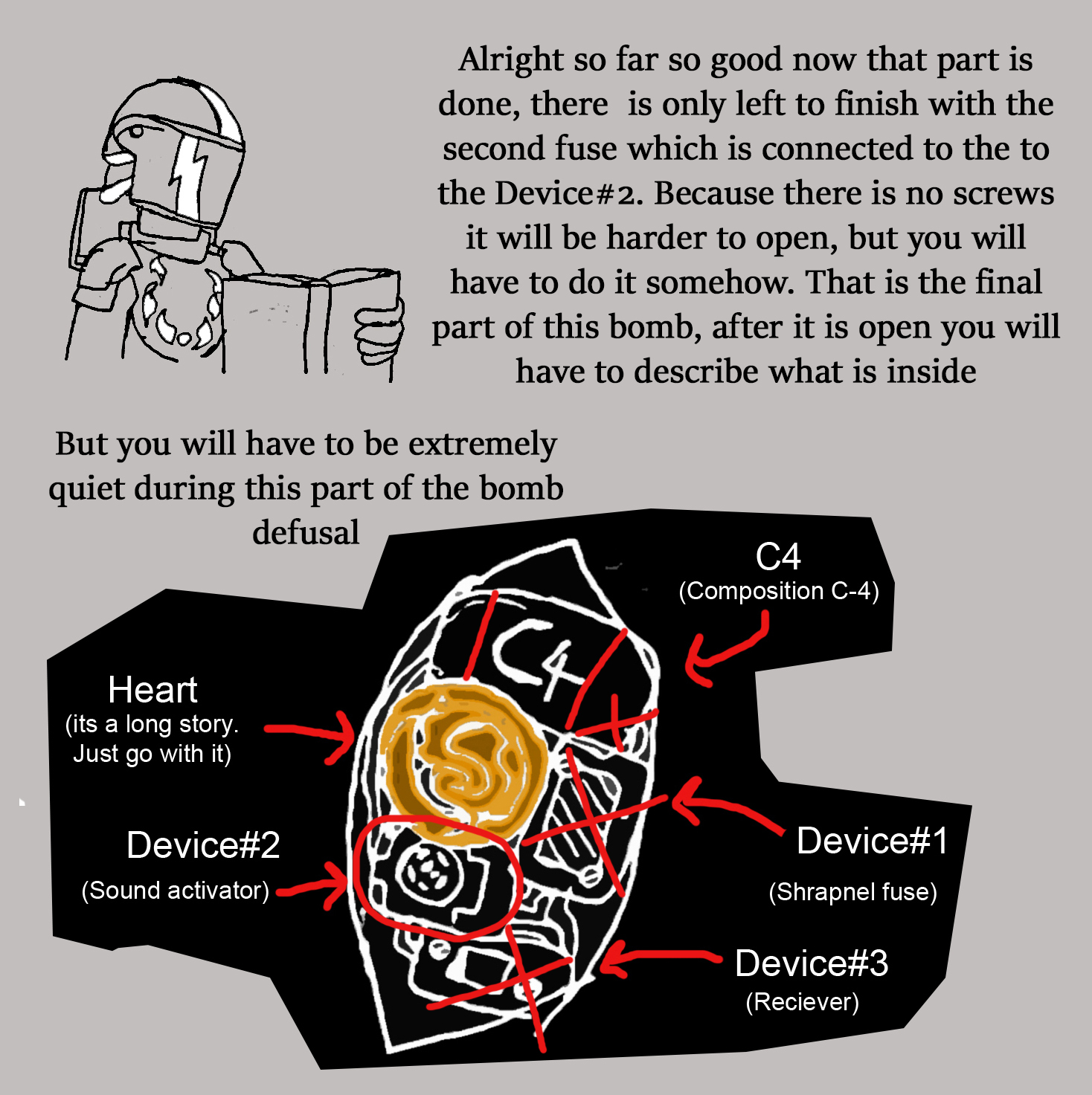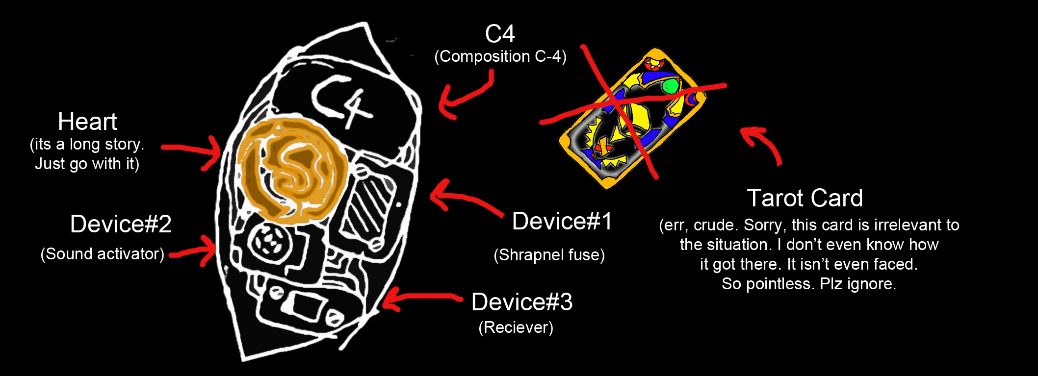 in the middle looks to be the sound receiver. to the right of it looks like it is connected by three paths leading into it, probably a special wire leading to three different areas to the right, up right, and down right corners. Surrounding it is a bunch of rectangles, starting from the top left is a "L" that had been turned a little clockwise, then to its right is 2 horizontal rectangles, then one short rectangle. Next to it touching the right side of the device a large backwards "C" with I think a button that was used as a trap for the button puzzle we were trying to solve. It is touching the entire right side of the device. on the bottom to the left of the backwards "C is one small square, one triagnle that looks like it might have used to have been a square that had been cut from the top right to the bottom left, and rectangle with a large X on it, a skinny horizontal rectangle, and finally an "L" shape touching the left corner of the device with a small square sitting on the leg of the L. This "L" was also a trap if we had push that button from the cover. on the left of the device and to the right from the wire that leads to the C4, we see 4 wires: from down to up: a wire colored like a barber shop pole except instead of it being white and red, it is green and red, a red wire, a blue wire, and a light blue wire.