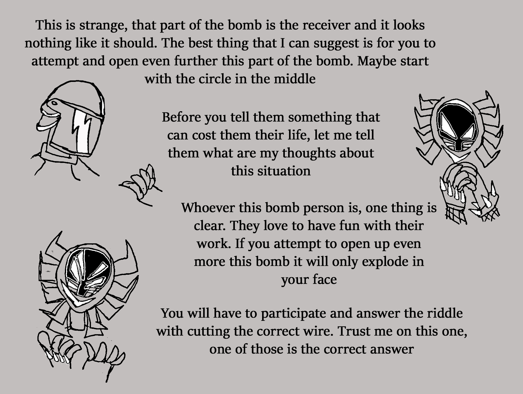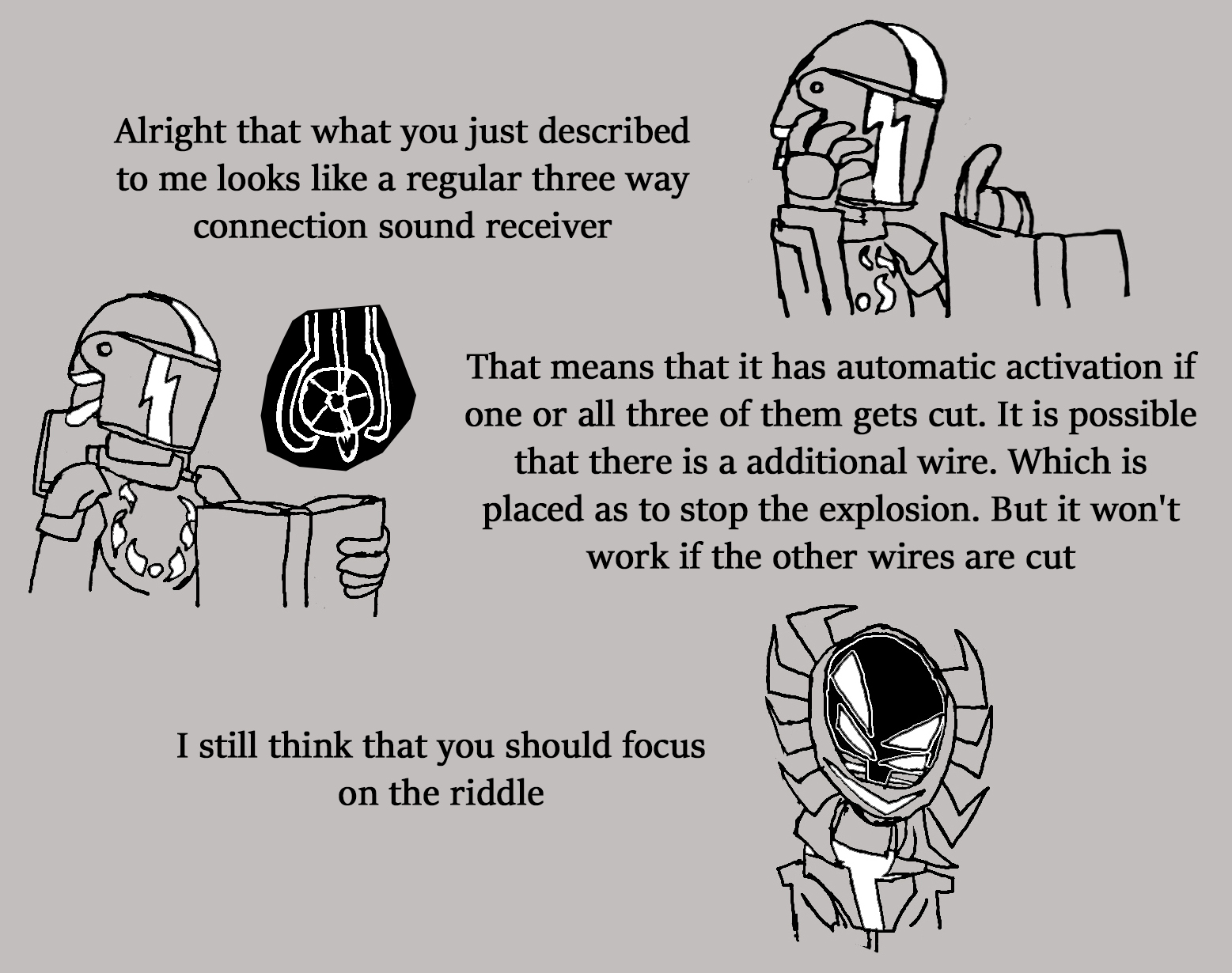 True. Right now, I'm leaning towards cutting the red wire since it is the only wire that is actually connecting inside the receiver, as well as it being the most likely answer to the riddle. You want to go for it and cut that wire as well?