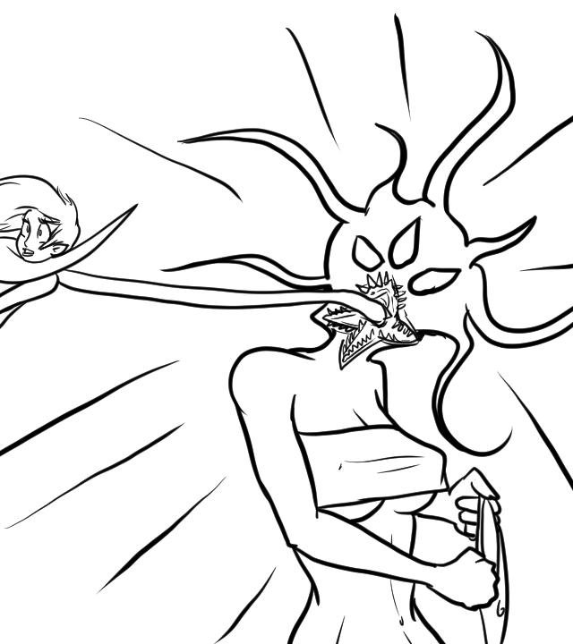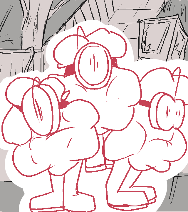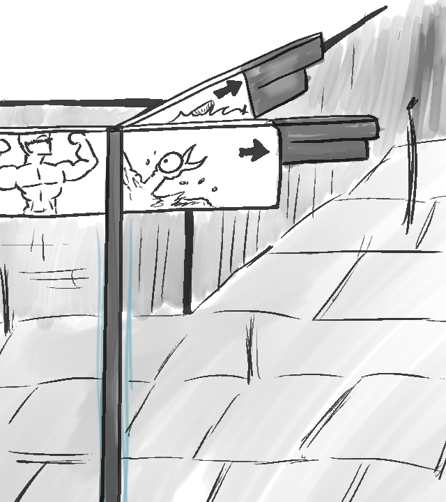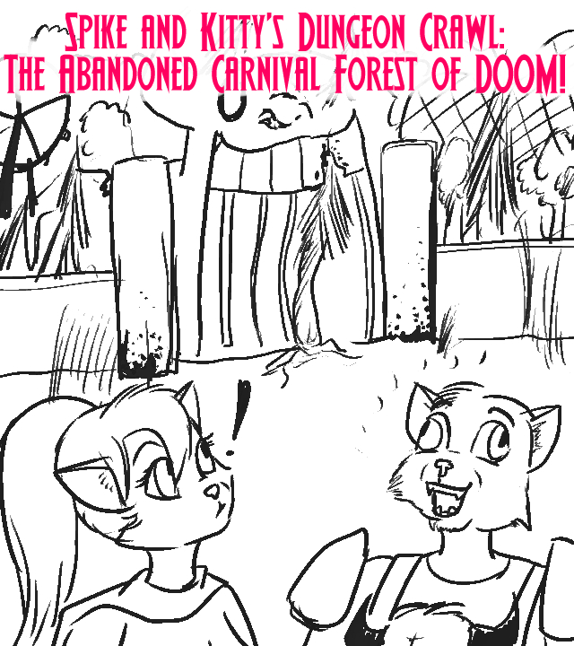The party leaves the Admissions Office and into the main part of the abandoned carnival. Old rides are rusted to the spot and overgrown with evil-looking gnarled trees, sickly fungus, and foul-smelling rot. The cracked concrete that would have formed the carnival's floor has been mostly retaken by the Forest of Doom until only a path of gravel and bits of slab remains. It was probably expensive to renovate the old carnival grounds with an evil forest, and the special lichen they're using literally doesn't grow on trees.