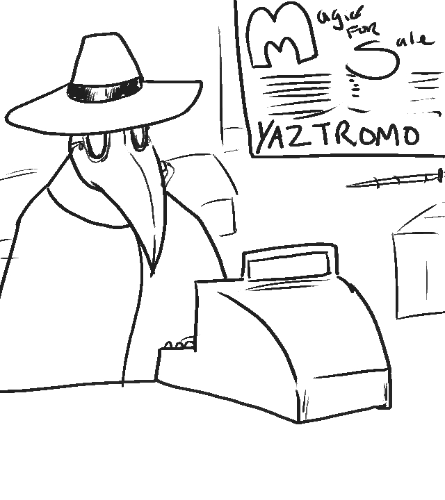 Bor... Yaztromo takes the party into the admissions office where he stands behind a counter. After punching some buttons on his register, a list of magic items for sale appears.