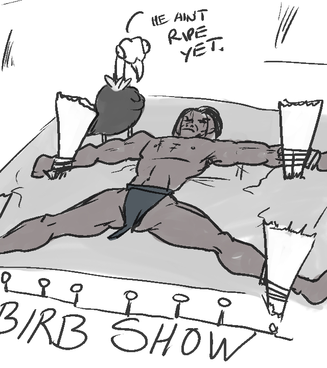 A man wearing a wide brimmed hat and some sort of metallic, bird-like mask greets you. He is wrapped in a wide, shiny cloak.